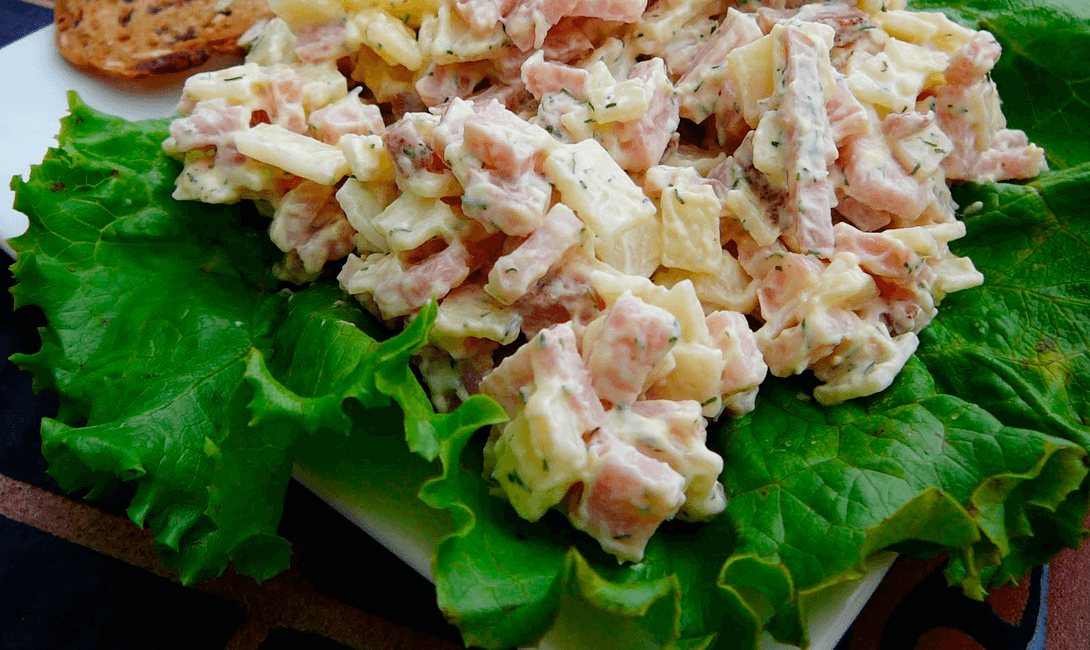 Салат из сыра и ветчины Идеально подходит для тех, у кого в холодильнике всегда остаётся небольшой кусок сыра, какой-нибудь травы и кусок ветчины. Не всегда же хочется закидываться бутербродами, иногда и что-нибудь более изящное подавай. Ингредиенты: