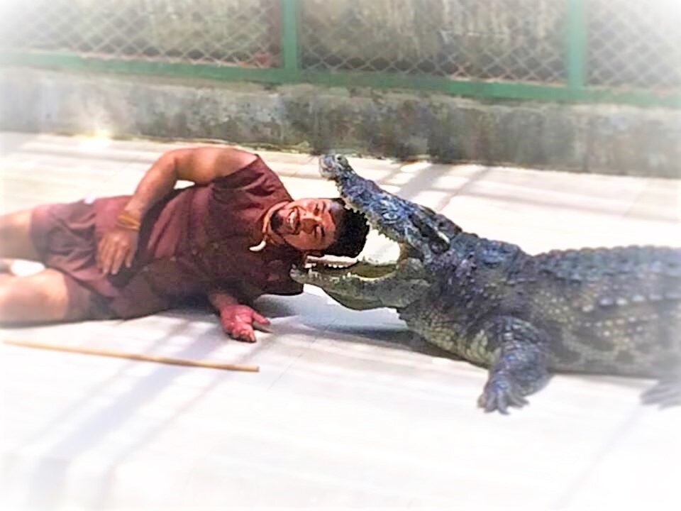 Мало кто знает,каким образом осуществляется этот самый опасный трюк в мире. Мозг у крокодила с грецкий орех, он - полный дебил, который узнает своего хозяина каждый день заново. Как же тогда его дрессируют, спросите вы? Это возможно благодаря знаниям об инстинктах крокодила. В дикой природе после сытного обеда крокодил разевает пасть и к нему слетаются мелкие птички, которые питаются частичками мяса, застрявшими между зубов этого хищника, а так же, присосавшимися к нему пиявками и мухами. Согласитесь,приятно избавится от застрявшего между зубов волокнистого мясца,а крокодил от этого натурально отлетает. Происходит мощнейший выброс эндорфина в кровь и крокодил просто некоторое время пребывает в абсолютном кайфе,идаже не думая о том, что б, кого нибудь сожрать. Ему настолько хорошо, что он пасть от счастья закрыть не может и вот в этот момент можно с ним делать, что угодно, хоть целуй, хоть гладь, хочешь голову в пасть засунуть - пожалуйста. Перед этим трюком крокодила кормят, а затем