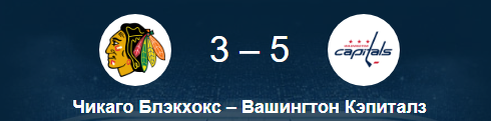 В турнирной таблице Восточной конференции "Вашингтон" занимает второе место, набрав 14 очков в 10 матчах. "Чикаго" расположился на 13-й строчке на Западе с 5 очками в 6 встречах. Чикаго – Вашингтон- 3:5 (0:1, 1:1, 2:3) 0:1 – 9 Оши (Кузнецов) 1:1 – 28 Каджула (А. Нюландер, Карпентер) 1:2 – 29 Дауд (Хагелин) 1:3 – 43 Овечкин (Кемпни, Карлсон) 2:3 – 46 Кубалик (Саад, Кемпф) 3:3 – 49 Кэйн (А. Нюландер) 3:4 – 51 Уилсон (Эллер, Хагелин) 3:5 – 59 Эллер (Орлов) Вратари: Кроуфорд 25/29-Холтби 4