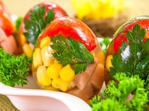 Из указанного количества ингредиентов получается 7 штук. Ингредиенты Приготовление Филе отварить до готовности (варить около 20 минут после закипания) в подсоленной воде. Нам понадобится 1 стакан бульона, в котором варилось филе. Желатин залить 100 мл холодной кипяченой воды. Оставить на то время, которое указано на упаковке. Яйца хорошо вымыть с содой. Затем у яиц с тупого конца сделать отверстие диаметром примерно 2–2.5 см. Вылить белок и желток в тарелочку, они нам не понадобятся, нам нужна только скорлупа. В теплой воде растворить пищевую соду. Замочить скорлупу (это делается для дезинфекции). Затем промыть ее под проточной водой. Ветчину (карбонад, окорок, колбасу) нарезать небольшими кубиками. Вместо ветчины можно использовать отварное куриное филе. Перец очистить от се