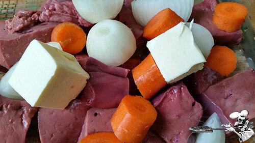 Начинаем. Греем духовку до 200 градусов, в посудину складываем крупно нарезанную печень, лук, морковь и треть сливочного масла. Ставим на 15 мин