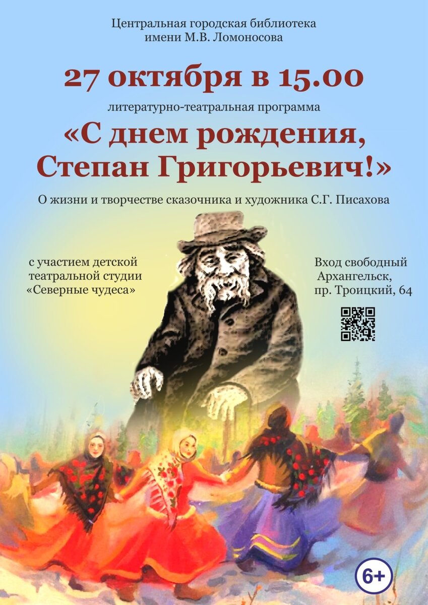 27 октября в 15 часов Центральная городская библиотека имени М.В. Ломоносова и детская театральная студия «Северные чудеса» приглашают всех желающих на литературно-театральную программу «С днем рождения, Степан Григорьевич!» В этот день гости и читатели библиотеки смогут послушать рассказ о жизни и творчестве Степана Григорьевича Писахова, нашего земляка, талантливого художника и сказочника. В 2019 году архангелогородцы отмечают его 140-летие. В Ломоносовской библиотеке будет представлена презентация с интересными фактами и редкими фотографиями. Книжная выставка «Сказочный чародей» познакомит со всеми изданиями, в том числе и самым первым – появившимся в Архангельске в далеком 1938 году. Главными участниками встречи станут юные артисты из театральной студии «Северные чудеса», которые напомнят зрителям веселые сказки Степана Писахова. Очень точно про эти неповторимые произведения сказал когда-то литературовед Борис Пономарев: «…Яркая индивидуальность и самобытность – основное в творчест