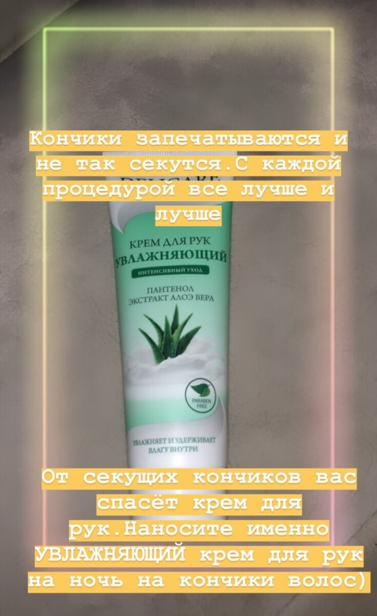 Секущиеся кончики- наши враги! Проблема секущих кончиков одолела всех девушек.. Многи считают, что секущиеся концы нужно только отрезать, если их не отрезать волосы превращаются в "солому" раньше я тоже считала что от этих ужасных кончиков меня спасёт только услуга парикмахера, много раз я отрезала 10-15 сантиметров себе сама, растила эти же сантиметры я 2 года. Со слезами на глазах отрезала волосы. Потому что расчесать их было невозможно, концы стали очень светлые, на ощупь очень сухие, ломаются. Вся квартира была усыпана моими обламливающимися кончиками.. НО! Я нашла очень хорошее средство, которое есть не только у девушек, многие парни тоже этим пользуются)) Это обычный "УВЛАЖНЯЮЩИЙ" КРЕМ ДЛЯ РУК. Первое время, когда узнала об этом рецепте, не поверила, но снова отрезать свои волосы не хотелось, решила попробовать. Попытка не пытка, зато длина не пострадает. И так, рассказываю. Возьмите любой "УВЛАЖНЯЮЩИЙ" крем для рук. Нанесите на кончики волос, и оставьте на ночь. Можно созда
