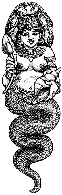 Индийские наги, пожалуй, являются наиболее удивительными магическими змеями. Они были по своей природе полубогами, детьми богини Кадру, и обычно появлялись в облике полузмеи-получеловека. Однако они могли принимать человеческий облик, и женские особи делали это гораздо чаще, чем мужские. Наги были и водными и земными духами. Судя по всему, существовало несколько видов нагов, и у каждого из них – свои характерные внешние особенности и окраска. Тело нагов, живущих в развалинах, местах с угнетающей атмосферой или под землей, покрыто черной чешуей с малиновыми полосами. Их лица похожи на человеческие, у них те же цвета кожи, глаз и волос. Однако этот вид нагов враждебно настроен по отношению к людям. Они могут зачаровать любого, кто встретится с ними взглядом; они могут плеваться ядом, ядовитым является и их укус. От этих нагов не стоит ждать помощи. Другие земные наги мудры, дружелюбны и охраняют священные места или сокровища, а также контролируют своих черных собратьев. Эти люди-кобры