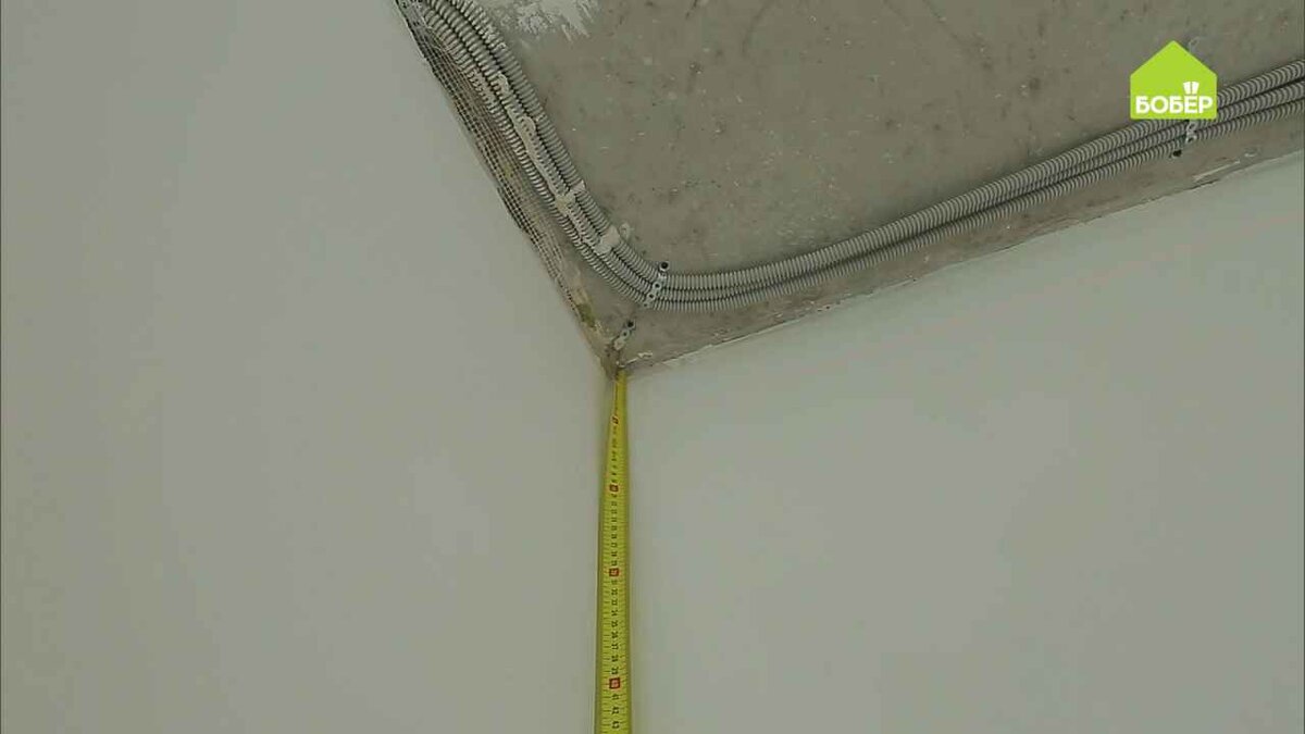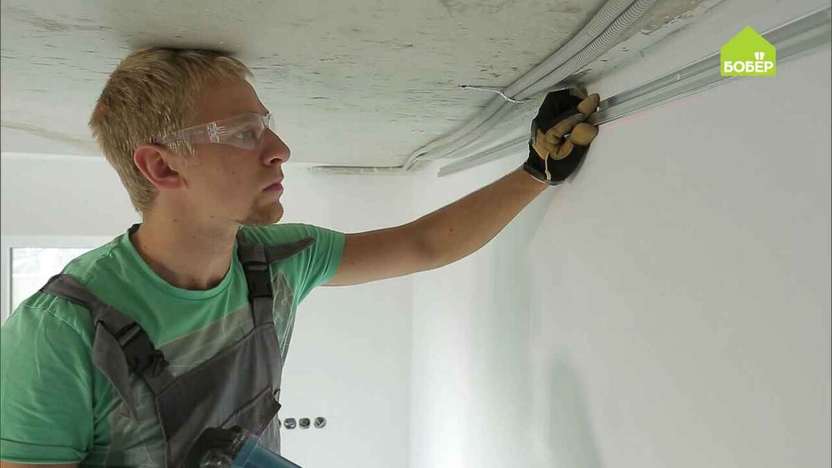Натяжные потолки нужны для того, чтобы скрыть неровности старого потолка, а также спрятать электропроводку или коммуникации. Выбираем высоту натяжного потолка, крепим металлический профиль к стене, строим закарнизку, стыкуем между собой металлический профиль и закарнизку. Чтобы смонтировать натяжной потолок, определитесь, на какой высоте он будет установлен. Для этого понадобится лазерный уровень. Как правильно, потолок кривой: с помощью рулетки и лазерного уровня промерьте углы, чтобы понять перепад. В нашем случае перепад составляет 6 см. Найдите самую низкую точку, потому что уровень показывает идеальный горизонт, и отступите от неё минимальное расстояние. Прикрепите металлический профиль к стене. Поскольку в данной комнате будет использоваться потолочный карниз, с помощью уголков нужно построить специальную конструкцию (закарнизку). Отметьте расстояние чуть больше, чем ширина карниза. Это нужно для того, чтобы впоследствии штора не ложилась на батарею и подоконник. Поскол