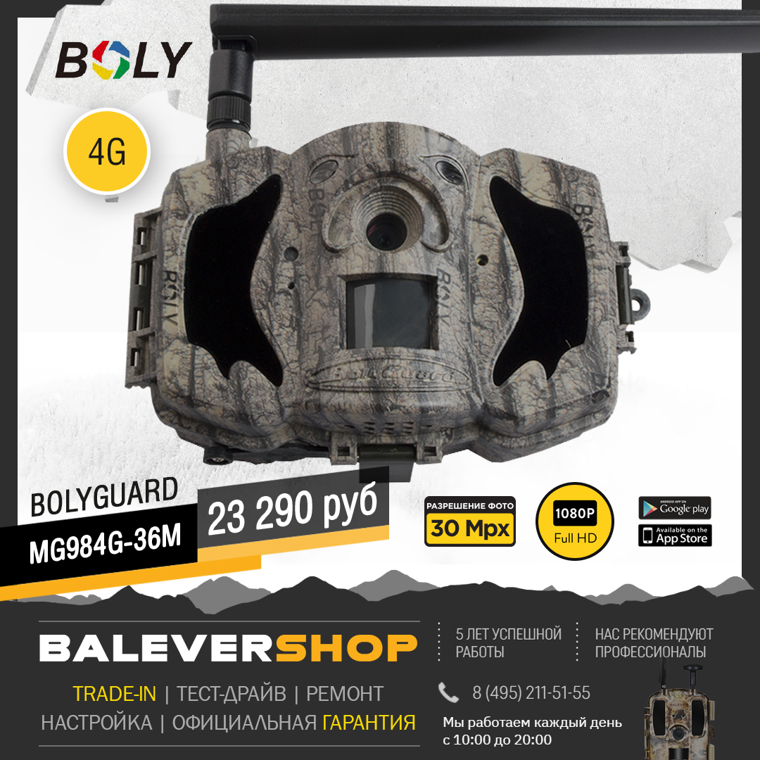 BolyGuard MG984G-36M - 4G фотоловушка, официально представленная в России в 2017 году. Фотоловушка может быть использована и как охранная сигнализация, оперативно сообщающая о несанкционированном вторжении в дом, дачу, офис или на охраняемую территорию, и как средство наблюдения за животными. Эта камера может управляться посредством SMS команд, а также с помощью приложений для Iphone или Android. При срабатывании датчика движения происходит автоматическая фотосъемка с качеством изображения до 30 Мегапикселей или видеосъемка (Full HD 1080p). BolyGuard MG984G-36M отправляет фотографии и видео на почту, MMS в случае срабатывания датчика движения, а также по расписанию.