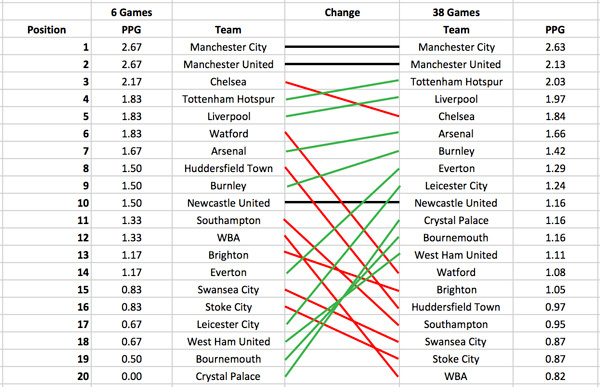 Каждый матч в футболе в рамках чемпионата той или иной страны может принести команде не более трех очков. В разрезе всей дистанции это не так уж много, но в некоторых случаях стоимость трех очков может быть выше, чем кажется. Вопрос только в том, какие победы оценивать выше? И, главное, когда победы важнее – в начале сезона, в конце или в середине? Есть несколько причин, почему одна победа может быть важнее другой, хотя в обоих случаях команда получает три очка. Например, если команда обыграла соседа по турнирной таблице или своего прямого конкурента, то такая победа будет цениться выше. Про такие матчи нередко говорят, что это встречи за шесть очков. Другой пример – победы на определенной части дистанции. В этой статье мы рассмотрим важность побед и в целом хорошего выступления в первые шесть туров. Дает ли лидерство на старте преимущество в дальнейшем? Ответ на этот вопрос мы попробуем получить на основе анализа выступления команд в одном из самых популярных чемпионатов – английско