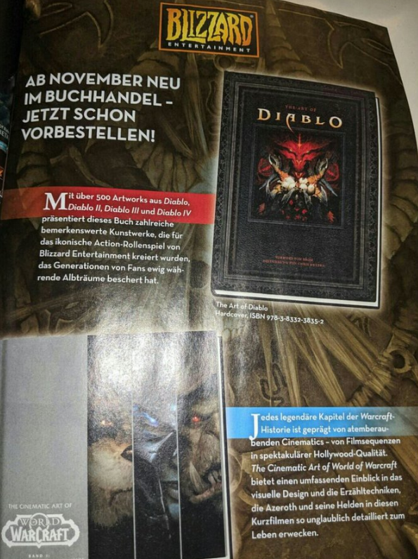Дата Blizzcon 1-2 ноября - все ближе и с каждым днем надежды фанатов на Diablo IV становятся прочнее и получают подтверждение. В рекламе еще не вышедшего артбука по Diablo в Германии нашли подтверждение скорого анонса новой версии. Книга должна выйти 3 ноября уже после выставки, поэтому надпись вполне очевидна.