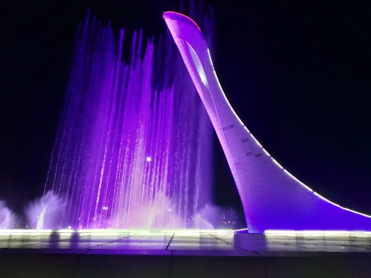 Здесь происходило торжественное открытие зимней олимпиады в Сочи в 2014 году , все, кто смотрел церемонию открытия, видели по телевизору это место . Прошло 5 лет , огонь уже не горит, а на месте церемонии открытия каждый день сотни туристов радует поющий фонтан . Он находится непосредственно вокруг олимпийского факела и называется чашей олимпийского огня, которая целый день хранит молчание , а вечером даёт потрясающий концерт .