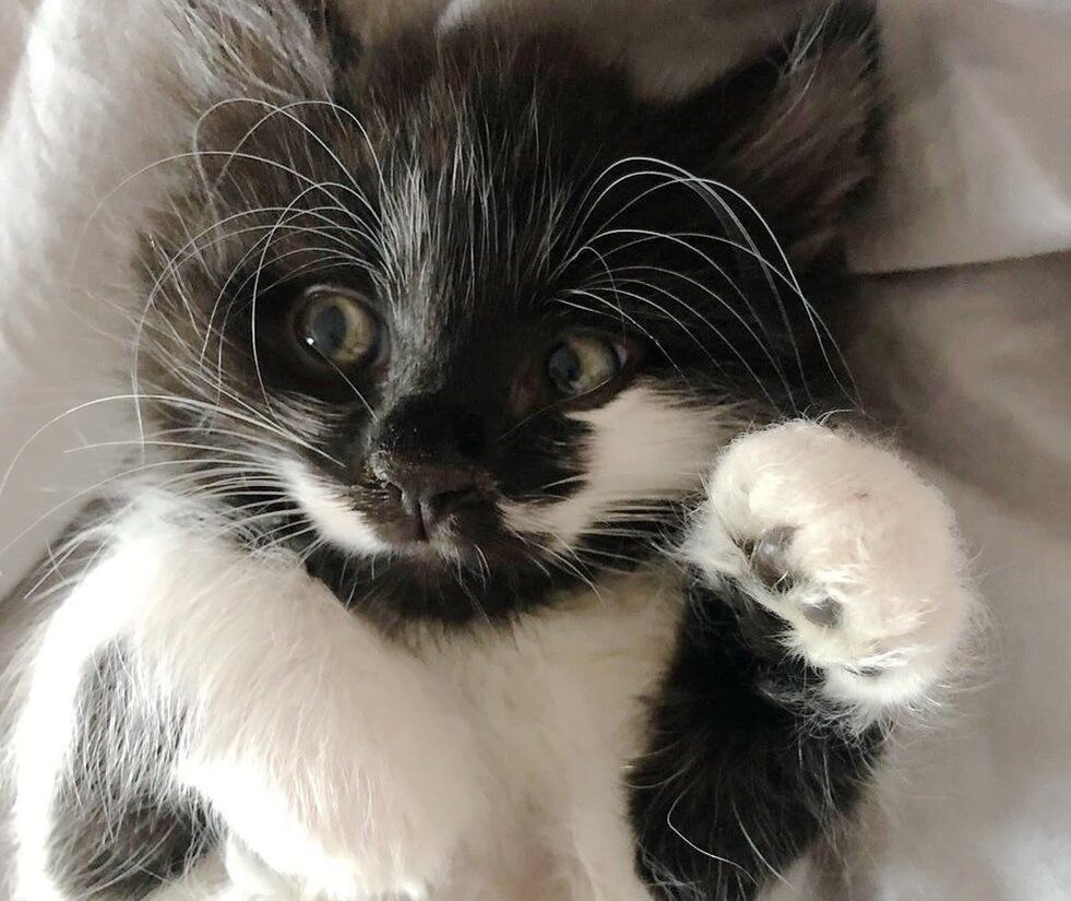 Привет! Очередная история о котёнке-девочке, которая уже была одной ногой на другом свете. Обо всём по порядку. Однажды, службе по защите животных поступило сообщение и трёх котят, которые совсем не давно родились на ферме. Их мама кошка куда-то исчезла, котята не могли выжить без неё. К сожалению, когда люди приехали к ним на помощь, двоих котят уже не было в живых. Но наша героиня черно-белая девочка боролась за свою жизнь всеми своими четырьмя лапами. Да, она осталась в живых, но была в критическом состояние. Без еды мамы кошки она могла умереть в любую минуту. Волонтёры назвали её Мейзи. Ей было очень тяжело. То-что она выжила настоящее чудо! К счастью из-за хороших ветеринаров и правильного питания, Мейзи смогла выжить и стать полноценной кошкой. К слову, Мейзи кушала не совсем как обычно кушают её сородичи. Она всем телом ныряла в миску и съедала всё до последней крошки. Наверное она думала, что купается в еде. Волонтёры пробовали кормить её из самых разных мисок, в которые не ка