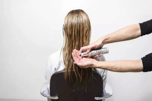 Шаг 1. На сухие чистые волосы нанести мусс для укладки. Средство распределяют по всей длине. На расческу с крупными зубчиками выдавливают мусс размером с шарик для пинг понга, расчёсывают прядку толщиной 5-6 сантиметров. Наносить мусс руками не рекомендуется, прядки спутаются и слипнутся. Мусс – средство, которое можно применять на волосы обильно. В нем практически нет утяжеляющих компонентов. Для всей головы потребуется 4-5 шариков мусса. Волосы должны пропитаться продуктом, это позволит сделать стойкую укладку и защитить от перегрева. На тонкие волосы используют мусс для объема, на плотные и густые прядки подойдёт любой мусс.