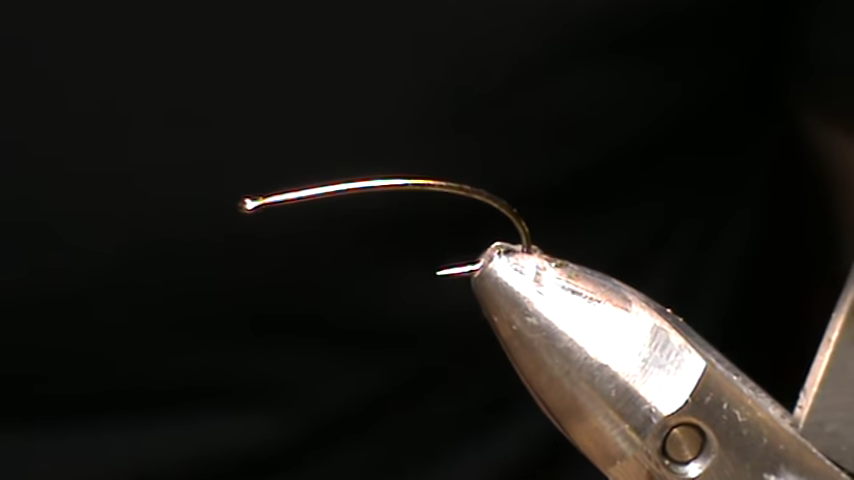 Затем начинаем обматывать ею крючок до самого ушка. Обмотав до ушка крепим конец наматывая черную нить.