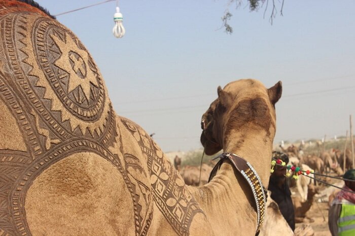 Мастер выстригает орнамент верблюду обычными ножницами. Многие тамошние мусульмане заменяют традиционную корову на более привычного верблюда. И чтобы привлечь покупателя именно к своему стаду, продавцы нанимают настоящего стилиста по