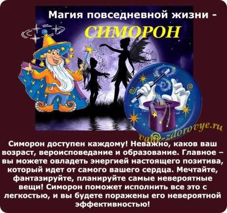 Любое искреннее желание реально исполнить. Если сделать всё правильно — Вселенная сама принесет вам сбывшуюся мечту “на блюдечке”. Дорогие читатели, давайте научимся сегодня исполнять желания с помощью Симоронских приемов «на скорую руку». Вот уже три десятка лет по планете шествует СИМОРОН — новаторская психотехнология, изменившая жизнь тысячам людей. Авторы её — украинские психологи Пётр и Петра Бурланы, которые считают, что каждый человек обладает неисчерпаемыми природными возможностями и способен достигать любые созидательные цели. Они указывают путь к реализации этих возможностей. Симорон отличают весёлые, простые и эффективные техники. В своих магических ритуалах они используют главное качество в жизни — чувство юмора. Симоронские обряды можно использовать повсеместно, улучшая качество своей жизни. С помощью этой техники можно реализовывать как простые, так и самые большие мечты. Всё, что понадобится — это красный фломастер, 2 небольших листочка белой бумаги (размером со