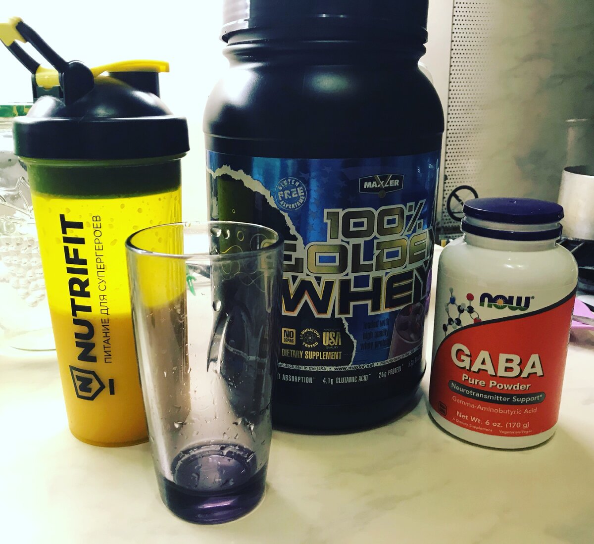 Треня закончена, я дома. Кушать пока не стоит, а вот протеинчику шлепнуть с габой в самый раз gaba кстати меня успокаивает очень хорошо. Рекомендую, а вот протеин от “mailer” меня не порадовал. (( Начнём с того, что размешивать его нужно только через шейкер, иначе будут комочки, со вкусом тоже не угадал, не люблю приторное, но зачем то взял со вкусом жвачки;) Думал не привыкну, но вроде заходит;) Габу купил на iHerb, а протеин в магазине, его название на шейкере, кстати шейкер говно;) Но дешевый, и его можно б\у заменит на новый за 150₽, если не ошибаюсь. Я его с собой не таскаю, так что пофик. Как то так...
