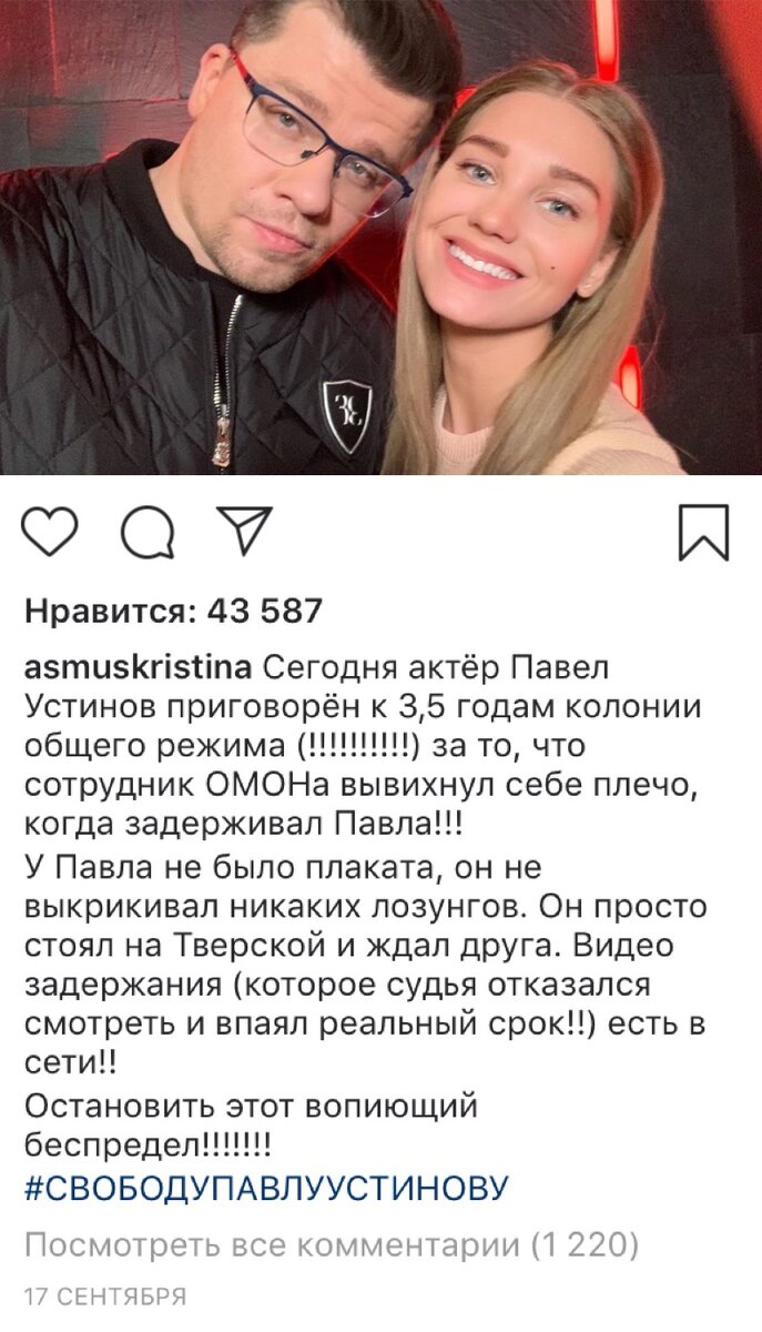 Есть еще одна категория медийных лиц, всякие блогерши, бьюти модели, инстаграм которых состоит из фотографий собственных поп и еды из ресторанов. Они никогда не пошевелят пальцем в защиту кого-либо, если о нем ранее не напишет какая-нибудь модная личность с миллионом подписчиков. Существует такое понятие как триггер. Это своего рода спусковой крючок, который заставляет нас срезонировать на определенное событие. Когда арестовали Устинова, для деятелей кино и театра триггером стал тот факт, что посадили своего (на остальных плевать). Далее, события раскрутились в более массовый характер потому что для блогеров, музыкантов и всех кто желает быть в тренде, захотелось поддержать любимых артистов, так сказать примкнуть, испытать чувство общности с ними.