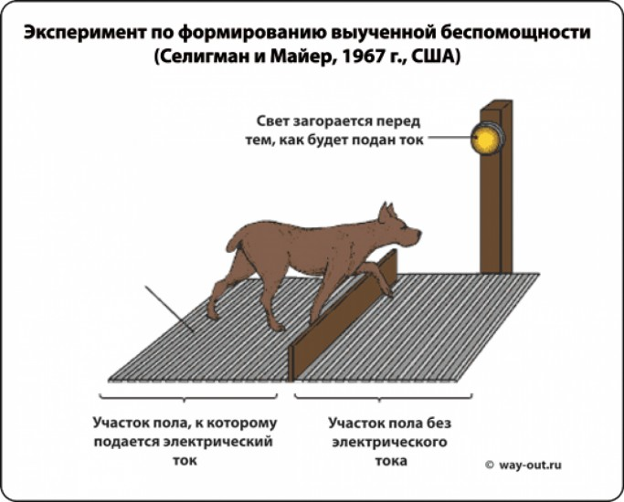 Как и обещала расскажу откуда же пошёл термин «выученная беспомощность». Этот феномен в 60-х годах прошлого столетия открыли американские ученые в результате экспериментов над собаками и они были похожи на павловские постановочные исследования. Возглавлял исследования Мартин Селигман. Суть эксперимента состояла в том, что собак поделили на 2 группы и содержали в закрытых клетках с металлическим полом, по которому пускали дозированные разряды электрического тока.