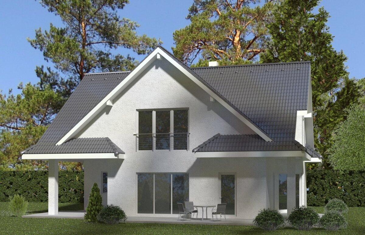 Здравствуйте. Представляем проект типового дома с белыми фасадами и большим остеклением. Габариты здания 10,5 *13 м. Общая площадь дома составляет 182,76 м2. Дом имеет интересную планировку за счет повернутых по диагонали стен и перегородок. На 1 этаже находятся большое крытое крыльцо, необычный восьмигранный холл с лестницей, гардероб, с\у, объединенная гостиная с камином и кухня-столовая с выходом на уличную террасу. На 2 этаже имеется лестничный холл, с\у, спальня, 2 спальни со встроенными гардеробными. Из двух спален имеется выход на отдельный балкон. Посетите наш сайт http://architecturaldesign.tilda.ws/