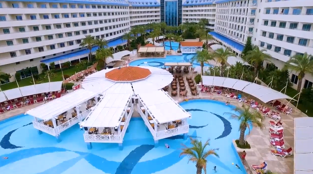 Отель наш располагается в 25 километрах от Сиде, практически на половине пути между Сиде и Аланьей. Открытие отеля состоялось в 2005 году. Реновация выполнена в настоящем году. На территории площадью 50 тысяч квадратных метров располагается шикарное здание отеля. Нужно сказать, что отель принадлежит широкоизвестной в Турции сети отелей Crystal. И называется он Crystal Admiral Resort Suites & Spa 5*. На территории имеются несколько бассейнов, два из которых имеют площадь чуть менее 1500 квадратных метров каждый. Как во всех отелях такого уровня имеется бассейн с водными горками. Помимо основного ресторана, функционирует пять ресторанов A la Carte. На территории у отдыхающих есть возможность посидеть в восьми барах, для сладкоежек работает кондитерская, есть турецкое кафе. В качестве минуса можно назвать пляж, отделённый от отеля автомобильной дорогой. Пляж песчано-галечный протяжённостью четверть километра. Конечно, все пляжные атрибуты для отдыхающих бесплатны, и на пляже есть бар.
