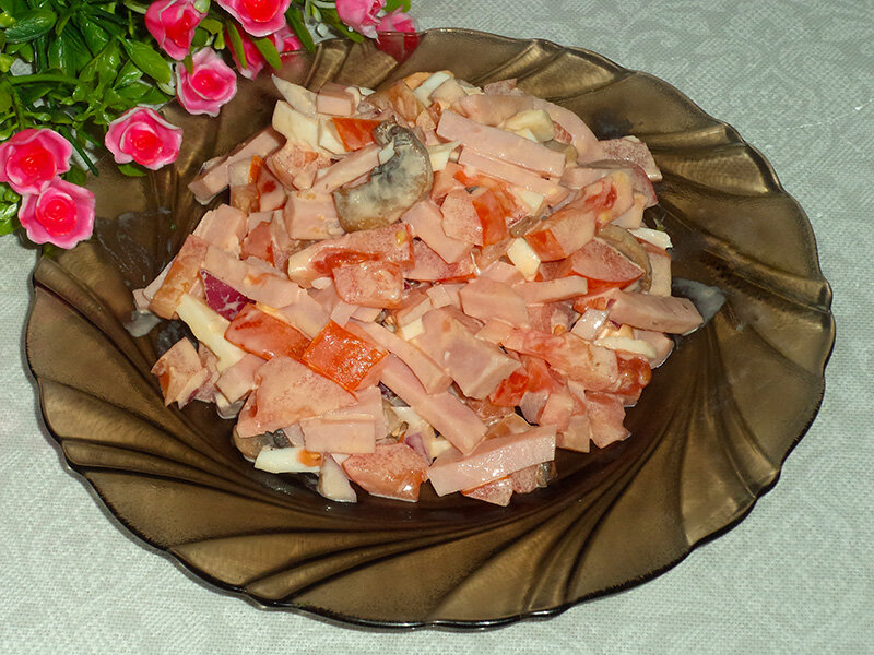 Достоинством салата можно назвать скорость приготовления и доступность продуктов. Я использовала шампиньоны, но для большего аромата рекомендую взять лесные грибы. Салат можно подавать как тёплым, так и охлажденным. Время приготовления – 20 минут Количество порций – 1 Какие продукты нам понадобятся: Как приготовить салат с жареными грибами и ветчиной: 1. Грибы нарезаем тонкими пластинками. 2. Обжариваем их в растительном масле с добавлением соли и перца. 3. Кубиками нарезаем яйца. 4. Соломкой нарезаем ветчину. 5. Мелко шинкуем сладкий, салатный репчатый лук. 6. Кубиками измельчаем помидоры. 7. Все ингредиенты салата, включая грибы, смешиваем и заправляем майонезом. Вот так легко и быстро мы приготовили вкусный и сытный салат. Приятного аппетита! Чтобы не пропустить новые рецепты, ставьте 👍 и подписывайтесь на Poperchi.Ru!