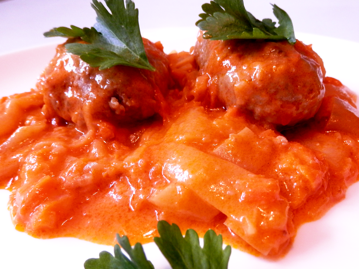 Долго подбирала идеальное соотношение продуктов для этого рецепта. Надеюсь, что и Вы попробуете приготовить и полюбите это блюдо. -------------------------------------------------------------------------------------------------- 1. Сначала приготовим рис. Это можно сделать двумя способами: Первый - 1/2 стакана рисовых хлопьев заливаем кипятком и даем постоять 10 минут. Второй - отвариваем пакетик риса до полуготовности (15 минут) без соли. Даем рису немного остыть. 2. Очень мелко нарезаем 1 луковицу среднего размера и смешиваем ее с 400 гр. мясного фарша и вареным рисом. Солим и перчим. Все тщательно вымешиваем. 3. Из фарша катаем шарики и придаем им удлиненную форму. Обваливаем в муке. (Остатки муки не выбрасываем). 4. Быстро обжариваем изделия из фарша на растительном масле до золотистой корочки. 5. Нарезаем овощи: морковь соломкой , лук четверть-кольцами. Перцы очищаем от сердцевины и режем кусочками, удобными для употребления. 6