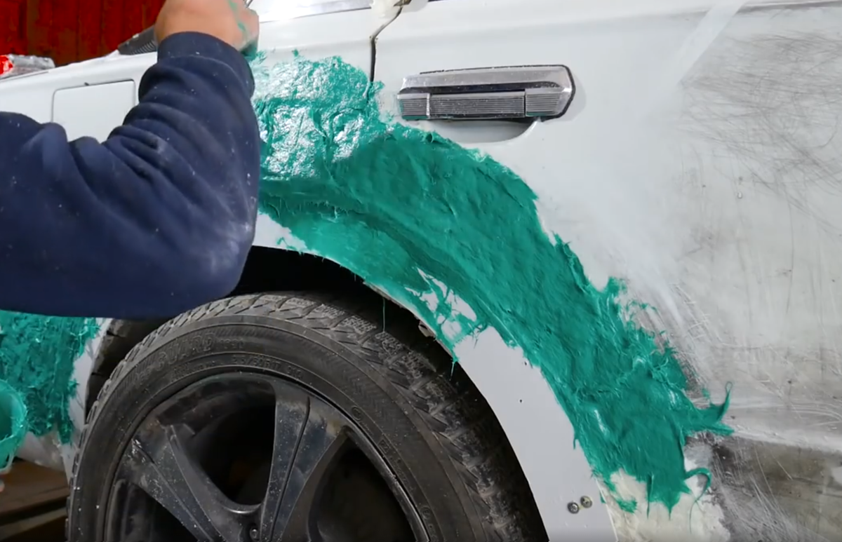 Клей на пене высох, и я принялся наносить стеклопластик на кузов. Смолу я готовил по одному литру, одного литра хватает на одно крыло, но наносить надо быстро, иначе смола загустеет.