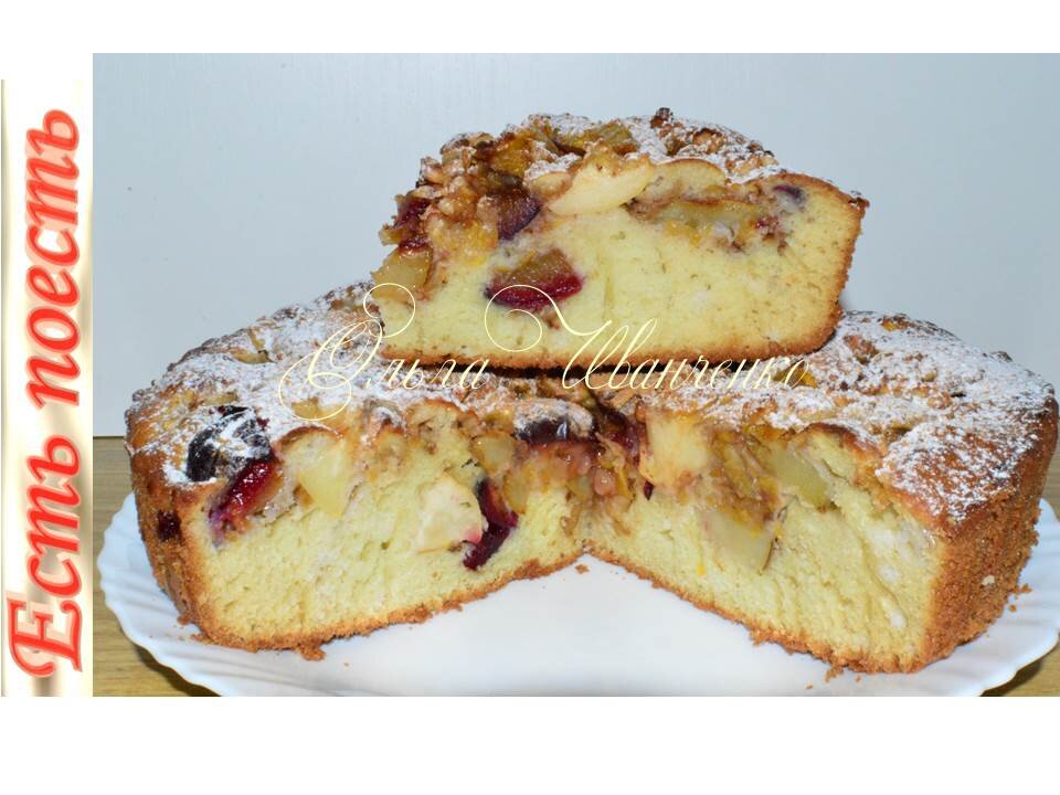 Я назвала пирог так, потому что в качестве начинки подойдут все фрукты и орехи, которые сейчас в достатке. Они отлично дополняют нежное лёгкое, воздушное тесто. А осеннюю нотку придают пряности, которые лучше положить щедрее. Конечно, такой пирог можно испечь в любое время года, положив замороженные или сезонные фрукты. Ингредиенты Тесто: яйца 3 шт, кефир 150 мл, сахар 130 г, масло растительное рафинир. 80 мл, мука 280 г, разрыхлитель 10 г, соль 2 щепотки, ванилин по вкусу. Начинка: яблоко 1шт, груша 1 шт, сливы 7-10 шт, тыква по желанию, орехи 50 г. сахар 2 ст.л, мука 2 ст.л, корица, кардамон, имбирь, мускатный орех, гвоздика, бадьян по вкусу. Для начинки порезать крупными кусочками очищенные от сердцевины фрукты. Тыкву можно тоже порезать, но я натираю на терке. Для теста все продукты должны быть комнатной температуры. Яйца взбить с сахаром, ванилином и солью до светлой пышной массы. Добавить кефир, масло, перемешать на малых оборотах миксера. Подсыпая муку с разрыхлителем, замесит