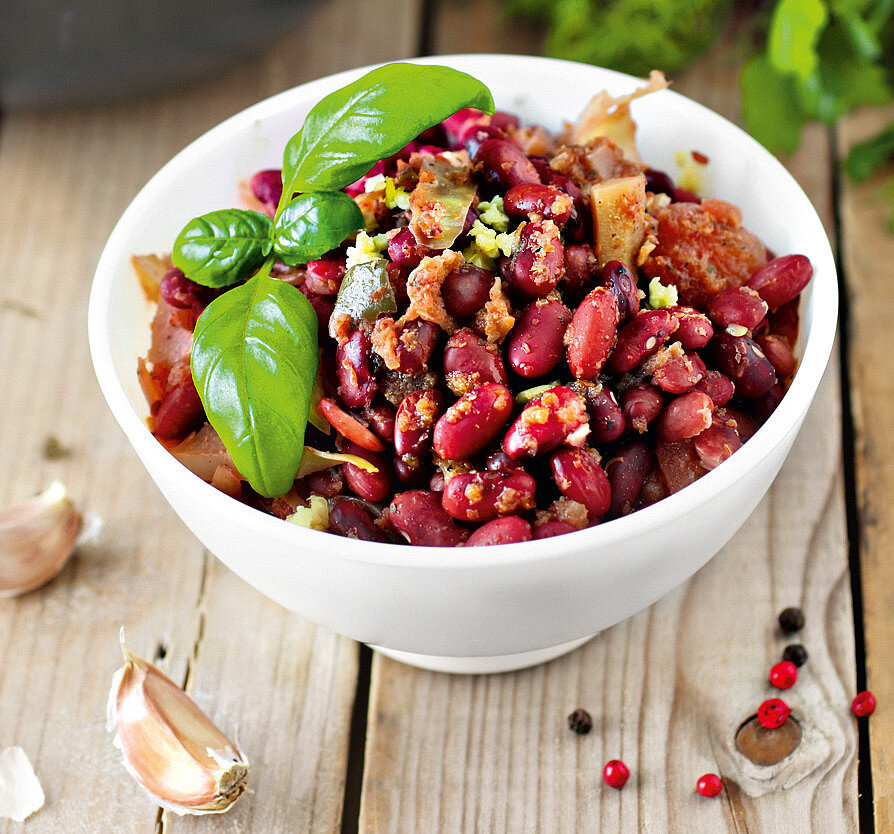 Это простое и очень вкусное блюдо из фасоли всегда стоит у меня на праздничном столе. Все мои гости знают, что будет вкусная фасоль и съедают её первой. Поэтому стараюсь приготовить её побольше. На приготовление этого блюда у меня уходит не больше 10 минут. Понадобится растопить 100 грамм сливочного масла и обжарить в нем 2 крупных лука нарезанных полукольцами до золотистого цвета. После того как лук обжарился к нему добавляем 2 банки консервированной красной фасоли в собственном соку. Сам сок я не добавляю. Перемешиваю и накрываю крышкой Измельчаю в блендере 100 грамм грецких орехов (если нет грецкого ореха, можно взять арахис) К фасоли с луком отправляю орехи, солю и перчу по вкусу. Пять минут томлю под закрытой крышкой, чтоб орехи немного размягчили. В конце выдавливаю 5 зубчиков чеснока и добавляю мелко нарезанную зелень( петрушка кинза и базилик) Это блюдо из фасоли очень сытное, в меру пикантное и очень-очень вкусное. Ингредиенты для закуски: - 2 банки консервированной красной