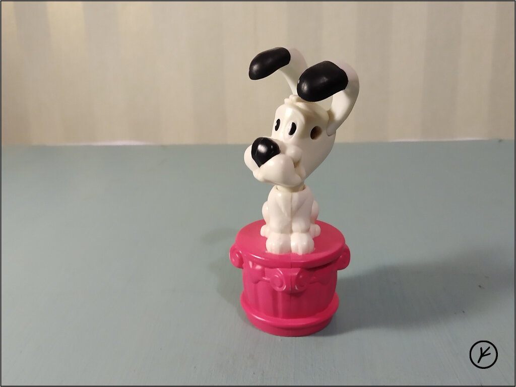 Сегодня мы рисуем с натуры игрушку из McDonald's, которую, скорее всего, выпустили в связи с фильмом «Астерикс на Олимпийских играх». Об этом свидетельствует постамент, похожий на колонну. Я запомнил, что собачку зовут Догматикс. Так ее называли в английской озвучке. Но вот на языке оригинала, на французском, ее зовут Идефикс. Традиционно схематично рисуем, что и где будет. Однако признаюсь, что вышло это с третьего раза. До этого я брал масштаб больше, чем могло уместиться. При этом рисовал только постамент без Догматикса. В рисовании постамента обратите внимание на четвертый шаг: я зачем-то провожу диагонали. В пересечении диагоналей находится центр независимо от того, находится предмет в перспективе или нет. Центр в этих областях мне был нужен для рисования сердечек. Однако в случае с перспективой все же точку, обозначающую центр, по правилам смещают немного вдаль. Но я этого не сделал, поэтому левое сердечко не вышло. Потом рисовал тело Догматикса. Во время рисования просто все вр