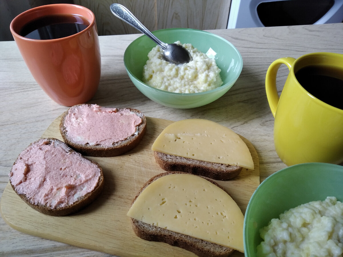 Завтрак - поели молочную пшенную кашу. И выпили по чашечке кофе с традиционными бутербродами. Я почти всегда ем с икрой, редко с сыром. Муж только с твердым сыром.