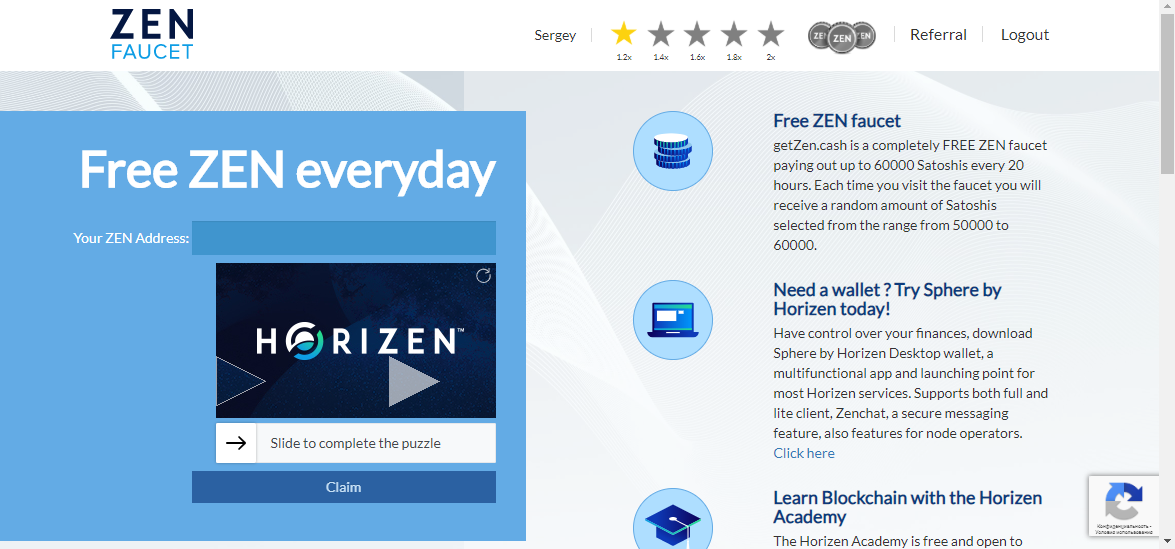 Нашумел в интернете этот краник.Раздаёт он монету ZEN которая торгуется практически на любой бирже.Дают 3.5 доллара не с разу а на 5 день,если не прерывать цепочку бонусов.Для заработка нам понадобиться кошелёк Zen я нашёл его на бирже бинанс.Вставляем,передвигаем ползунок и жмём кнопочку.Всё монетки на кошельке.Раздаёт кран 1 раз в сутки.Так что заходим раз в сутки в течении 5-ти дней и ждёт нас счастье в размере 3.5 бакса.