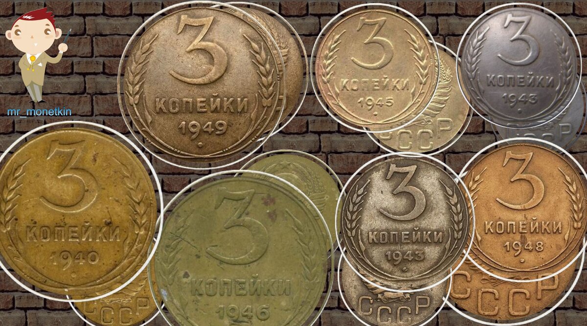- 3 копейки 1949, шт. 2.20 Ф-69; №101 по Федорину. Перепутка по аверсу: 20 копеек 1948 года. Монета редкая, средняя стоимость не превышает 150.000 рублей, однако максимальная цена - 270.000 рублей - coins.lave.ru в 2013 году.