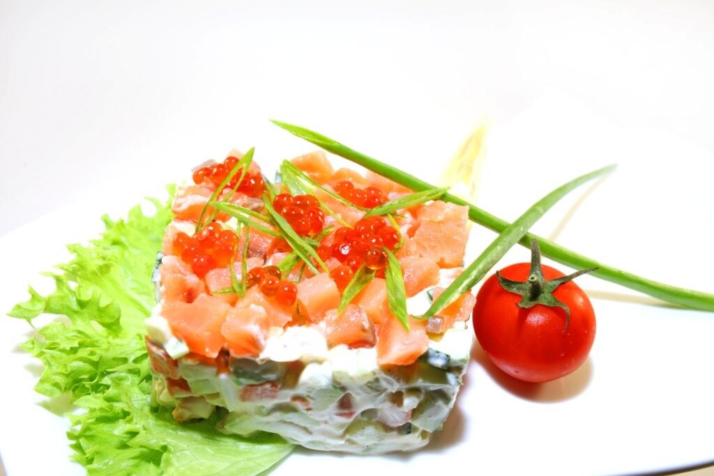 Под Новый год многие из нас ждут чуда и… оливье. А что, если их объединить? Получится необычный, но очень вкусный салат с красной рыбой. Для многих данное блюдо станет полной неожиданностью, ведь в известной закуске привычнее увидеть колбасу или мясо, в крайнем случае — курицу. Подойдет как для тесного междусобойчика, так и для более торжественных случаев, поскольку практически все виды красной рыбы достаточно дороги. И уж точно: если вы хотите чем-то удивить своих дорогих гостей, поставьте на стол оливье с семгой и свежим огурцом или оливье с лососем. Как их приготовить, будет описано ниже. Оливье с красной рыбой и свежим огурцом В быту красной рыбой называют горбушу, кету и форель. Последняя — самая дорогая из перечисленных видов. Не в ущерб качеству можно приготовить вкуснейший оливье с любой красной рыбой . Например, взять достаточно бюджетную горбушу, которая в большом количестве «водится» в магазинах. Сама по себе, в качестве закуски, она немного суховата. Но свежие овощи и соу