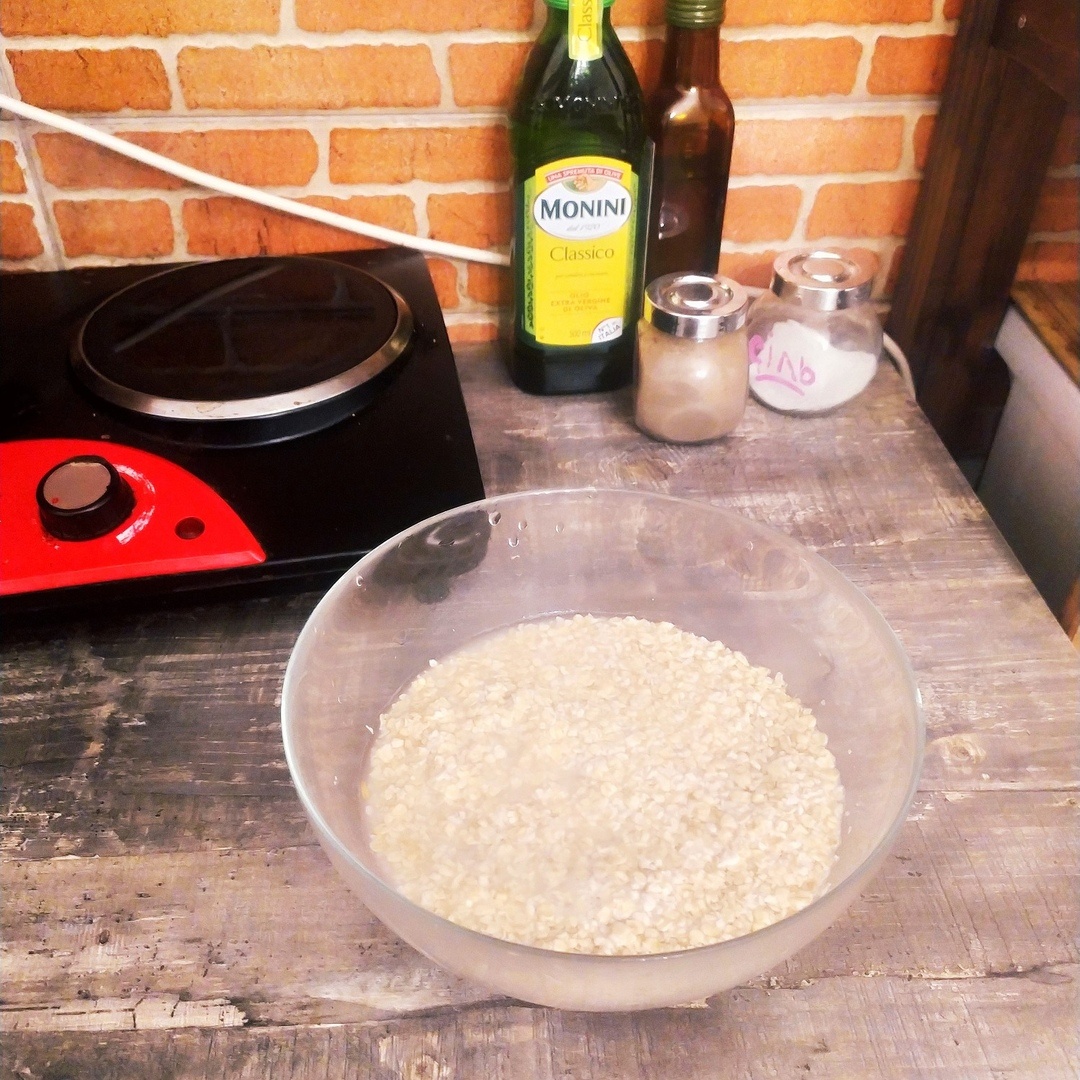 1. Насыпаем овсяночку в глубокую миску и наливаем холодной воды вот как на фото. 2. Добавляем специи, и забываем на время.