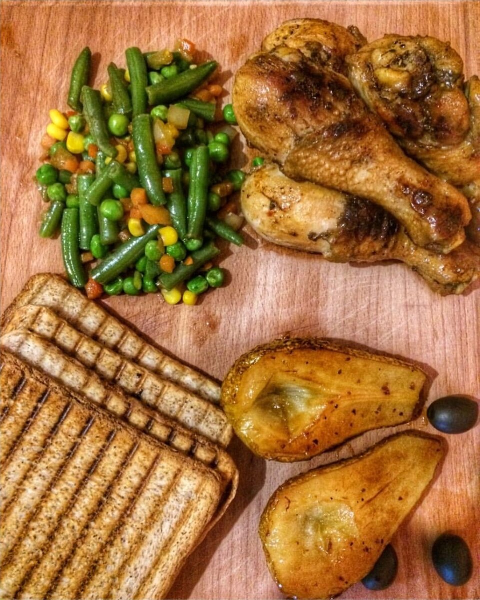 ИНГРЕДИЕНТЫ : Порция : 2 1. Куриная голень - 4 шт 2. Мексиканская смесь - 300 гр 3. Хлеб для тостов - 4 шт 4. Груша - 1 шт 5. Оливковое масло - 40 мл 6. Сливочное масло - 50 гр 7. Сахар - 2-3 ст ложки 8. Корица - на кончике ножа 9. Горчица - 1 ст ложка 10. Мед - 1 ст ложка 11. Соевый соус - 1 ст ложка 12. Соль/ перец по вкусу 13. Чеснок - 1 зубчик СПОСОБ ПРИГОТОВЛЕНИЯ : Готовим маринад для курицы, для этого мы берём, мед, горчицу, соевый соус, оливковое масто (1 ст ложку), 1 зубчик чеснока, соль, перец. Смешиваем ингредиенты, обмазываем курицу готовым маринадом и оставляем в холодильнике под плёнкой на 30 минут. Пока курица маринуется, обжариваем тосты на гриле , предварительно сбрызнув гриль оливковым маслом и обжариваем тост с двух сторон. Далее приступаем к приготовлению карамелизированной груши. Грушу разрезаем на 2 части, очищаем от сердцевины. В разогретую сковороду выкладываем сливочное масло, всыпаем сахар и мешаем до образования карамельный