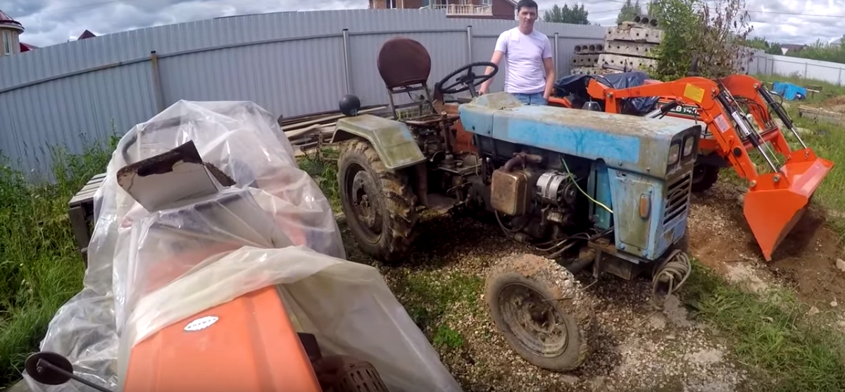 Всем привет. Кто давно читает, помнит что мы купили самодельный трактор, на данный момент трактор не очень хочет работать и времени на ремонт его совершенно нет, потому что идет сенокос погода стоит, то хорошая и плохая.В общем нам в этом году нужно убрать сено, но трактор не хочет ездить. По этому появилась необходимость найти трактор на замену на какое-то время. Большой суммы денег у нас нет, большой трактор мы не рассматриваем, потому что у нас узкие подъезды в некоторых местах, плюс огород свой который мы хотим обрабатывать. Поэтому большой трактор Т-40 МТЗ мы не рассматриваем.Воббщем что нам требуется на данный момент: первое- минитрактор, второе- вал отбора мощности, третье- дизельный двигатель. "Русский" Неподлаеку едем смотреть 1 трактор. Приехали трактарок посмотреть. Вот и т-25 Владимирец без кабины. Состояние сами видите, вообще на нём толком не ездили, резина потрескалась, фонарей никаких нету, центрального нету, яблок нету. С проводкой зажигания проблема, ключа нет