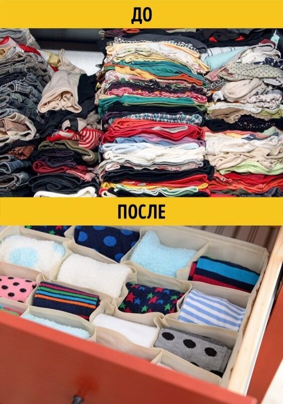 Если у вас в шкафу постоянно не хватает места для вещей, он ими просто забит, вы постоянно не можете отыскать там нужную вещь, вы тратите много времени и сил на то чтобы их сложить, а уже через некоторое время ваш шкаф превращается в склад непонятной кучи шмоток, то вам необходимо пересмотреть способ хранения и складывания вещей! В этой статье я покажу как можно сложить компактно и аккуратно вещи, так, чтобы они не падали при каждом доставании, чтобы каждая вещь была на виду и чтобы они не перемешивались в кучу, а лежали красивыми, аккуратными, ровными стопочками в вашем шкафу! Во первых, вы можете приобрести органайзеры для хранения или вместо этого сложить вещи в картонные коробки, так они будут лежать там компактно и не будут разваливаться, а так же сложить их в привычные стопочки следущими способами: Или же такой простой вариант, с помощью которого можно будет уложить футболки вертикальным способом в выдвижной ящик или коробку-органайзер: Спасибо, что прочли статью! Ставьт