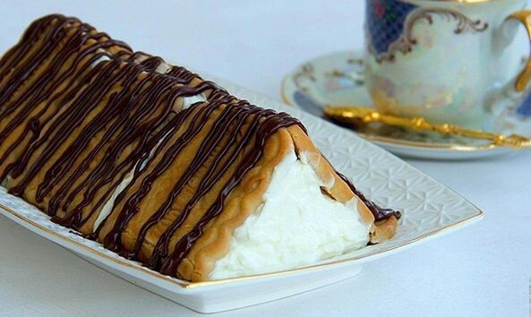 Поднимите с помощью пленки два боковых ряда печенья и прижмите их к творожной массе. Должен получиться вот такой домик.