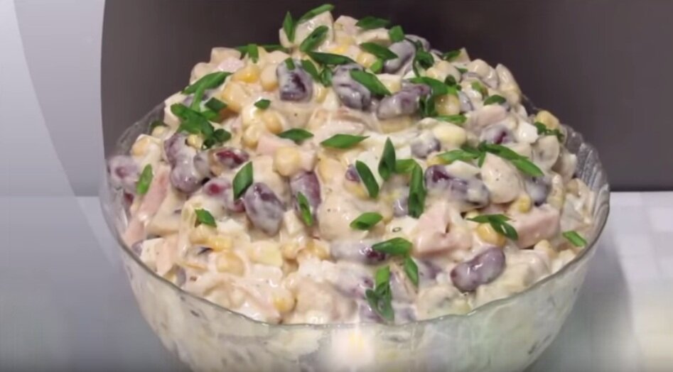 Этот салатик относится к категории универсальных - подойдет как для семейного ужина, да и на праздничный стол поставить не стыдно. Блюдо получается очень сытным, нежным и сочным. Ингредиенты простые и доступные всем - диковинных продуктов в списке нет. Ингредиенты Для приготовления салата "Ассоль" нам потребуется: Приготовление салата Яйца отвариваем в крутую, остужаем, очищаем от скорлупы и мелко рубим. Грибы освобождаем от сока и нарезаем небольшими кусочками, если грибы целые. Ветчину нарезаем сначала кольцами, а потом мелким кубиком. К нарезанным ингредиентам добавляем фасоль, кукурузу. Лук нарезаем полукольцами и обжариваем на небольшом количестве подсолнечного масла до золотистого цвета и добавляем в салатницу. Перемешиваем салат, заправляем майонезом, солим и даем немного остыть и настояться в холодильнике перед подачей. Очень вкусно добавить немного остроты с помощью зубчика чеснока или зеленого лука. Салат готов! Приятного аппетита! Понравился рецепт? Скажи спасиб