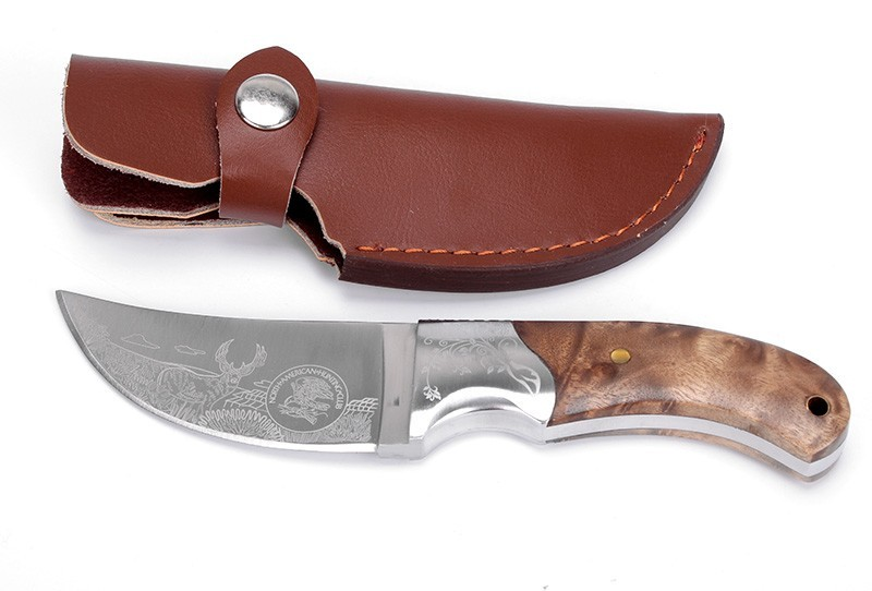 * Материал ножен: кожа. Рукоять ножа образована деревянными накладками с небольшими притинами из металла. На клинке можно видеть лазерную гравировку, т. н., «хохлому» . Не знаю кому как, а конкретно на этом ноже она мне нравится. Если зарезюмировать, то получаем небольшой, но весьма крепкий нож, правда, справедливос
