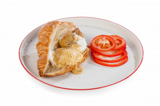 - На тарелку положить разрезанный круассан, сверху яйцо, полить голландским соусом, положить нарезанные помидоры и красный сладкий перец.