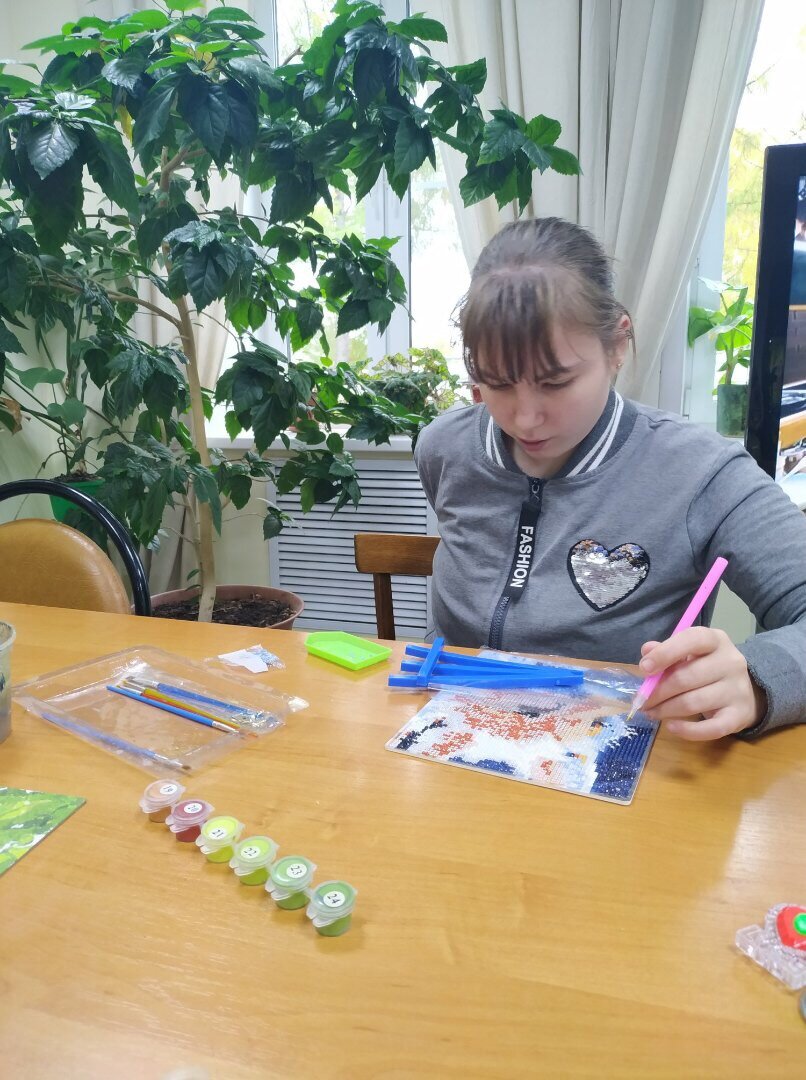 Ирине С. 20 лет, уже два года она живёт в доме-интернате для престарелых и инвалидов. Сюда она попала из детского дома. У Иры свои диагнозы, проблемы и непростая судьба, но она — самый неунывающий, добрый и милый житель дома престарелых. До умопомрачения любит животных, особенно кошек, любимый мультик — "Алладин" и романтичный фильм "Сумерки". Лучшее воспоминание — концерт Филиппа Киркорова, на котором побывала весной. Она рада, что в этом году ей прокололи уши, и теперь ходит с серёжками. Иру знают все в доме и каждый по чуть-чуть опекает и присматривает, она как внучка для всех. Сейчас у Иры новое увлечение - «алмазная мозаика» или живопись стразами. Увлекается Ира много чем, но все, что чересчур сложно, ее немножко пугает, поэтому алмазная мозаика, хоть это и кропотливая работа, но для Иры оказалась увлекательной. Тем более, сейчас она собирает лисичку, которая похожа на ее любимую игрушку. У Иры большие планы на это хобби — она хочет делать такие картины дальше и одну из них по
