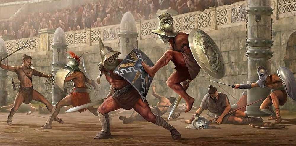 Как уже упоминалось, на самом деле бои представляли собой обыкновенный спорт. Бои, напоминавшие современное фехтование, устраивались для набора популярности кандидатами в сенаторы. Двое сражавшихся, крайне редко больше, примерно равных по уровню и количеству побед (что напоминает весовые категории нынешних спортсменов) бились затупленным оружием до первой крови, соблюдая строгие правила, за которыми следил судья, который по необходимости объявлял таймаут или вовсе заканчивал бой. Бои проходили в амфитеатрах, которые стали чем-то вроде символа романизации (Futrell, A., Blood in the Arena: The Spectacle of Roman Power (Austin: University of Texas Press, 1997) 53-76). Всего было построено около 200 каменных амфитеатров по всей Империи и ещё 200 были переделаны из других зданий. Помимо боёв, арены также знали другие типы зрелищ: венацио, или травлю зверей, и массовую казнь преступников.