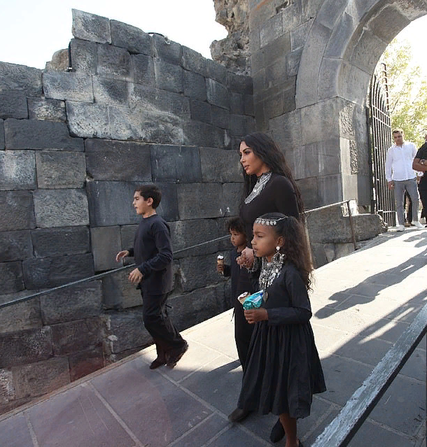 Ким, ее дочери и сын посетили исторический храм Гарни в национальных армянских костюмах, ну или попытались приблизить свои наряды к национальным: черная одежда с серебряными нагрудными украшениями и украшениями на голове. Как было позже отмечено, эти украшения были ручной работы армянских ювелиров.