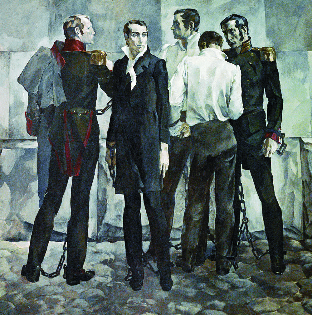 Немного об известной картине Вот эту картинку все знают, она на всех иллюстрациях. Такой очень знаковый пример романтизации декабристов. Все пятеро - молодые, стройные, красивые. Точно опознаваем только Рылеев при этом:) Спиной - ну, наверно, Каховский, так они с Рылеевым смотрятся вместе красиво и картина приобретает некоторый мессидж. Не про "смотрите какие романтические эти пятеро", а про то, "что я думаю про коллизию Рылеев-Каховский, поэтому все остальные - фоном". Из двух военных - один, видимо, Пестель, второй, видимо, Сергей Муравьев-Апостол, ну и кто-то из белорубашечников - Михаил Бестужев-Рюмин. Не знаю, который. В общем, на меня наконец выпала атрибутация картинки, так что делюсь ей. Автор - питерский художник Петр Александрович Игнатьев, с 1945 года, член союза худодников. Это работа - 1971 года, эскиз для росписей в Комендантском доме. Это его дипломная работа в Академии Художеств, оценка - отлично. Вот еще одна его работа, "Физики": В общем, это все скорее об излете ро