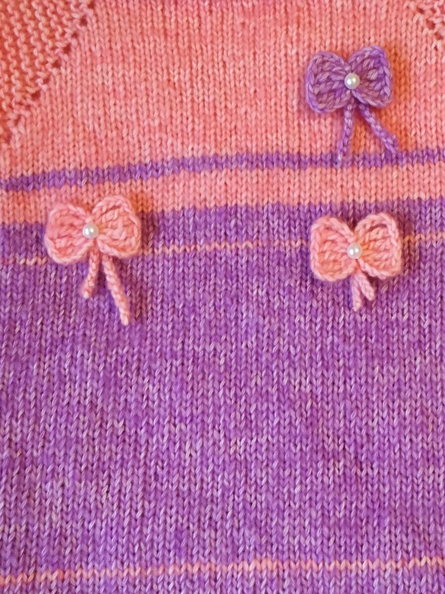 Что связать из остатков пряжи? Как вариант- любимым регланом сверху детский жилет с асимметричным низом. У меня осталась пряжа "Фиджи",фиолетового и персикового цвета, чуть больше мотка на каждый цвет (ранее из этой пряжи вязала дочке сарафан ) Спицы круговые 3. Узоры: платочная вязка - при вязании по кругу чередовать лиц. и изн. ряды. Прибавка реглана: из одной петли вывязать три- 1 лиц., не доставая спицу из петли накид, ещё 1 лиц. Лицевая гладь- все петли лицевыми. Воротник, рукава и низ изделия свяжем платочной вязкой, спинку и перед лицевой гладью. Набираем нитью персикового цвета 62 петли и вяжем 6 рядов платочной вязкой. Затем отметим петли реглана: 9 п. спинки, 1 п. реглана, 8 п. рукава, 1 п. реглана, 24 п. переда, 1 п. реглана, 8 п. рукава, 1 п. реглана, 9 п. спинки. Далее будем вывязывать росток. 5 лиц., накид, перевернем вязание, накид остаётся на правой спице (далее по умолчанию после слов"перевернем" накид остаётся на правой спице). 10 изн., накид, перевернем. 10 лиц., н