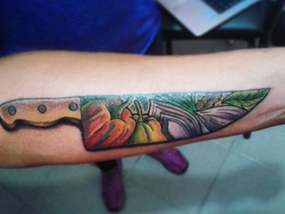 Нож может служить не только холодным оружием, но и быть превосходным украшением тела человека. Такого мнения придерживаются те люди, которые выбрали его в качестве своей татуировки. Нож может красоваться на теле как одиночно, так и в окружении различных элементов, в числе которых сердце и кровавые капли. Это влияет на значение тату. Подобный нательный рисунок предпочитают в большей степени мужчины, так как нож – это оружие довольно агрессивное. Однако его можно встретить и у девушек, причем весьма хрупких.