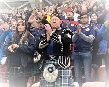 Станций за пять до места уже слышно нестройное «Россия!». С одной стороны скандируют, с другой, пока не понимаешь, что люди в шарфах и с триколором на лице, уже повсюду. Но к этому взгляд готов, все-таки дома играем. Приятно удивило другое: шотландцы. Статные, брутальные мужчины, преимущественно - 50+. С татуированными ногами, в килтах (язык не поворачивается сказать: «в юбках»), некоторые в шляпах с длинными фазаньими перьями. На шляпах россыпь значков с тех матчей, где побывали. Они кучковались по четыре-шесть человек, держались уверенно, гордо, но дружелюбно. Наши времени зря не теряли, фотографировались с колоритными гостями. Везде: на станции, на эскалаторе, даже на ходу. Я тоже хотел было достать телефон, но не стал. Успею еще с шотландцами запечатлеться, после матча просторней будет.