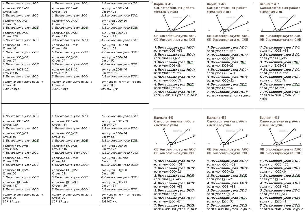 Доброго времени суток! С помощью этой страницы генерировал 6 вариантов по теме смежные углы с ответами и к ним задания без ответов. Номер варианта это средняя цифра. Детям дал ссылку тренажёра самостоятельной работы, многие подготовились и справились с ней. Вы можете воспользоваться готовым набором самостоятельных работ, а можете их сами генерировать. Я делал это так: 1. В Word поля поставил по 1 см, вставил таблицу 2. Из странички https://309167.xyz/Смежные-углы-печать/ выделил вариант, копировал, вставил в Word 3. Зашел на страничку и обновил её (нажал F5 на клавиатуре) 4. Повторил для 6 вариантов. 5. Выделил всю таблицу, копировал и вставил её. 6. Во первой таблице убрал рисунки, во второй ответы В зависимости от версии Word рисунок может не копироваться. В этом случае рекомендую на клавиатуре нажать клавишу PrtScr зайти в Word нажать вставить в меню обрезать рисунок Для детей перед самостоятельной работой предлагаю пройти тренажёр https://309167.xyz/Смежные-углы-тре