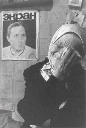 На этом потрясающем и уникальном снимке фотографа Юрия Рыбчинского жительница деревни Мериново (ныне Садовая) Вологодской области Ефимия Быстрова. Это именно она «сыграла» роль старушки Куделихи, матери Егора Прокудина - главного героя кинокартины Василия Шукшина «Калина красная». Я не ошибся, взяв слово «сыграла» в кавычки. Дело в том, что Шукшин планировал в этой роли снимать Народную артистку СССР Веру Марецкую. Но перед началом съёмок она внезапно тяжело заболела. Оператор фильма Анатолий Заболоцкий услышал от жителей деревни, где проходили съёмки, что есть у них соседка с очень похожей судьбой, которую Шукшин написал в сценарии. Когда Василий Макарович пообщался с Быстровой, понял: это подарок судьбы! Никакая народная артистка ТАК не сыграет! Решили снимать её «скрытой камерой», чтобы не смущать. Вся эта знаменитая сцена снята абсолютно документально. Ефимия Быстрова просто рассказывала актрисе Лидии Федосеевой-Шукшиной о своих сыновьях: что четырёх убило на войне, а пятый бессле